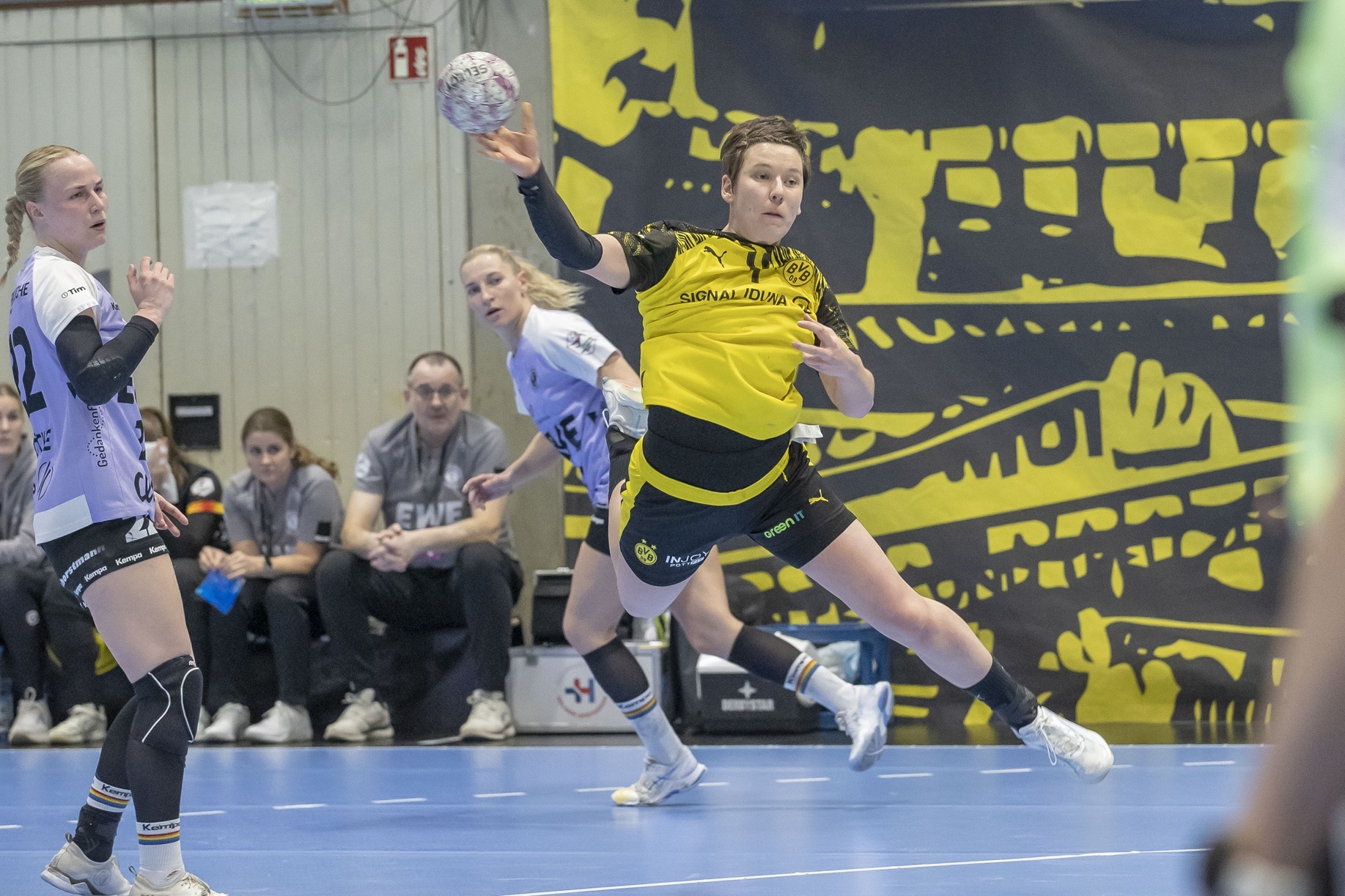 Diese brachte jedoch nicht allzu viel ein, vielmehr stellten die Gäste auf 2:7 (7.). Dortmunds Handballerinnen fingen sich allmählich und kamen durch Treffer von Dana Bleckmann (11.), Déborah Lassource (12.), Alina Grijseels (13.) und Guro Nestaker (15.) auf 7:8 heran.