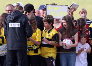 Die geringe Zahl an Mitfahrer schlug sich auch im Trainingsbesuch nieder. Während im letzten Jahr die Einheiten am Vor- und Nachmittag stets sehr gut besucht waren, war vor allem das Vormittagstraining am Mittwoch und Donnerstag eher sehr spärlich besucht. Neben dem mitgereisten Anhang, dürften noch gut 40 weitere BVB-Fans aus dem Umland die Einheiten verfolgt haben. Dies änderte sich allerdings am Nachmittag, wo Jürgen Klopp & Co. einen wahren Ansturm auf das Training erlebten. Irgendwie aber auch kein Wunder, denn wer hat von der arbeitenden Zunft schon früh morgens Zeit das Training zu verfolgen, ganz davon zu schweigen, dass in Baden-Württemberg noch keine Ferien für die Schüler sind.