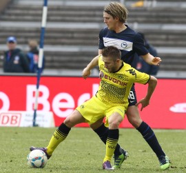 So kam es in der 39. Minute zu einer strittigen Szene: Großkreutz maschierte an der Seitenlinie, ein Herthaner stellte sich ihm in den Weg. Beide Spieler schoben, zupften und warfen sich in den Ball, Großkreutz bekam dafür einen Freistoß – das hätte genauso gut auch anders herum ausgehen können. Auf der anderen Seite brachte ein schönes Zusammenspiel von Kuba und Picsczek eine Ecke ein. Obwohl die Statistik nun immer deutlicher in Richtung BVB ging (61% Ballbesitz, 52% gewonnene Zweikämpfe, 2:9 Torschüsse), konnte man nicht von einer besonderen Überlegenheit sprechen – der Abstiegskandidat hielt gegen den deutschen Meister sehr gut dagegen. Daran konnte auch der letzte Angriff der ersten Halbzeit nichts mehr ändern, bei dem sich der sehr agile Picsczek bei einem Zusammenprall mit Thomas Kraft verletzte.