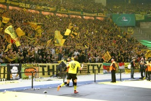 Dann tauchte vor unseren Augen das imposante Olympiastadion auf, nach dem Westfalenstadion sicherlich das schönste deutsche Stadion und auch beim dritten Mal noch immer eine Erscheinung. Wir wollten nur noch rein! Ich gehöre nicht gerade zu den größten Fuβballoptimisten und hatte es kaum für möglich gehalten, die Bayern drei Mal in einer Saison zu schlagen. Wenn, dann würde es knapp werden, eine Zitterpartie, ein Herzschlagfinale. Hauptsache, wir können gut dagegen halten, konzentrieren uns und machen den Bayern das Leben so schwer wie möglich, damit wäre ich zufrieden gewesen, damit war ich auch 2008 zufrieden gewesen. Als der Ball in der 3. Minute im Tor lag und ich von irgendwem einen Meter in die Luft gehoben wurde, fasste ich nicht, was mir geschah. Die Zeit danach gab uns etwas Luft, um darüber nachzudenken. Doch je länger ich das tat, umso unrealistischer wurde der Gedanke, dass wir in Führung lagen. Der Ausgleich der Bayern war folgerichtig und dessen Richtigkeit dürfte nicht angezweifelt werden. Doch nach einer Weile zeigte unsere Borussia wieder ihr gewohntes Gesicht und als der Schiedsrichter auch für uns Elfmeter pfiff, bekam ich eine Faust aufs Auge! Zu früh gejubelt, dachte ich für mich, noch ist er nicht drin. Das könnte auch nach hinten losgehen… Die Elfmeterzweifel waren über Jahre genährt worden und konnten angesichts mangelnder Möglichkeiten auch in jener Saison nicht ausgeräumt werden. Meine Freundin drehte sich ab, wir anderen drei schauten mit gekreuzten Fingern, die Hände halbwegs vor den Augen mit gebanntem Blick und bis in die letzte Sehne angespannt auf das entfernte Tor. Das Netz zitterte, wir flogen wieder übereinander hin! Und dann die Nachspielzeit, viel zu lange, ich wollte mit der Führung in die Pause, wollte durchfeiern. Doch die Feiern wurden jäh unterbrochen vom nächsten Torjubel!