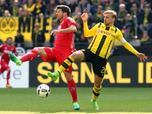 Als die Gästefans ihre Mannschaft minutenlang mit Wechselgesängen nach vorne zu peitschen versuchten, spielte Aubameyang einmal unwiderstehlich seine Schnelligkeit über die linke Seite aus und sein Querpass fand Reus, der aber beim Schuss leicht in Rücklage geriet und verzog. Nach einer knappen halben Stunde schien die Führung für die Schwatzgelben nur noch eine Frage der Zeit. Doch dann kochte Subotic Reus ab und trieb den Ball nach vorne zu Rudnevs. Dessen Ablage fand Jojic und der verfehlte den Kasten nur knapp. Plötzlich schien der BVB wieder verwundbar zu sein. Auch Bittencourt marschierte kurz darauf durch die Dortmunder Abwehr wie das Messer durch die warme Butter. Zum Glück schaffte er kein präzieses Abspiel auf Rudnevs mehr. Beim BVB sollte man spätestens jetzt ausreichend an die Kölner Qualitäten im Konterspiel erinnert worden sein.