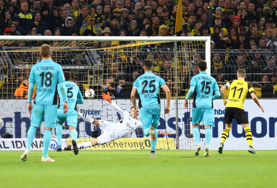 Und so musste Freiburg dann doch nachhelfen. In der 39. Minute lief Sancho mal wieder mit Ball in den Strafraum und Dominique Heintz trat ihm so klar wie dämlich auf den hässlich-blauen Fußballschuh. Frank Willenborg entschied auf Elfmeter, der Videoassistent hielt die Klappe und Reus versenkte den Ball stumpf in die Mitte.