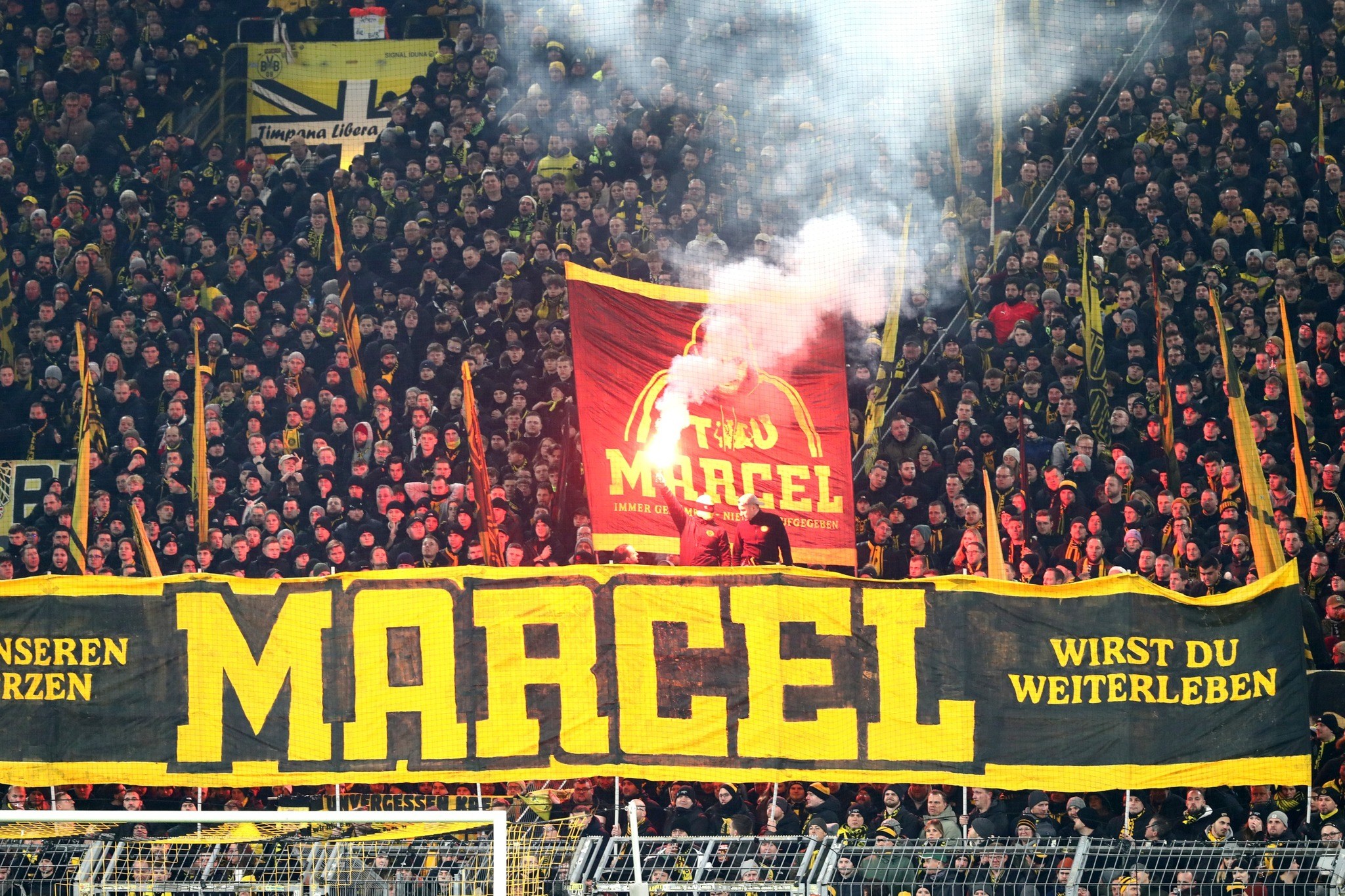 Zur 2. Halbzeit gedachte "The Unity" dann ihrem verstorbenen Mitglied Marcel, dessen Todestag sich zum ersten Mal gejährt hatte. Ein großes Banner und ein Doppelhalter mit einer Bengalofackel machten ein schönes Bild. Gesungen wurde "Leuchte auf mein Stern Borussia", was zwar stimmungsvoll war, aber leider gar nicht zum laufenden Spielgeschehen passte. Sei's drum!