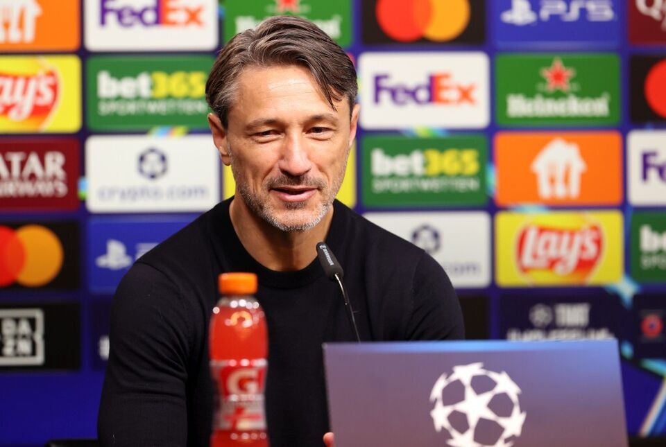 Trainer Niko Kovac auf der Pressekonferenz zur Championsleague. Im Hintergrund eine Tafel voller Sponsoren, im Vordergrund eine rote Flasche. Kovac trägt einen schwarzen Pulli und spricht verschmitzt lächelnd in das Mikrofon