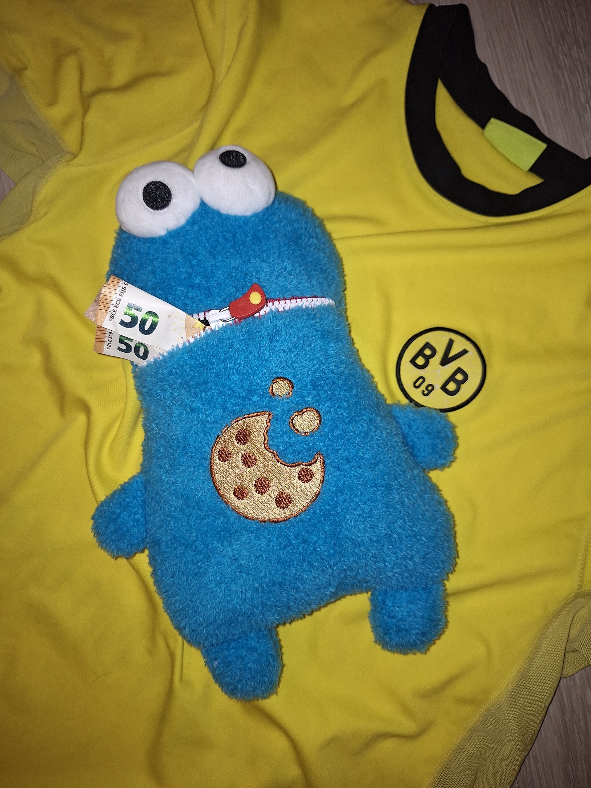 Foto eines BVB-Trikots mit einer Plüschfigur des Krümelmonsters. Das Monster hat einen Keks auf dem Bauch und als Mund einen Reißverschluss, aus dem zwei 50 Euro Scheine hervor schauen