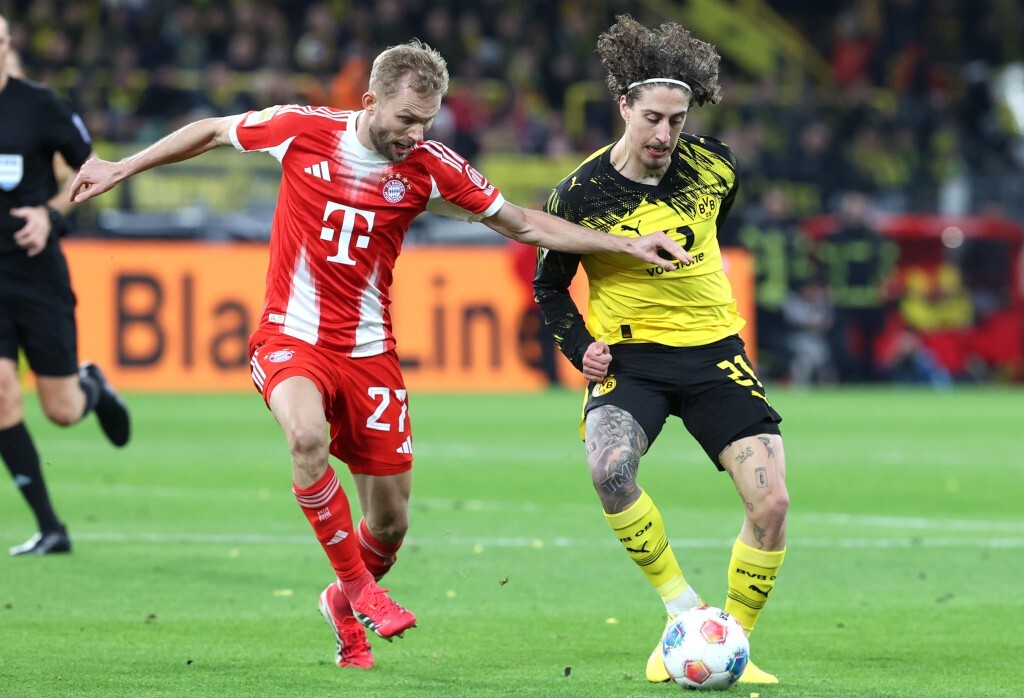 Da sind es 11 Punkte. Zwar ließ die Anfangsphase nichts Gutes vermuten: Die Schwarzgelben jagten dem Ball meist hinterher, während die Bayern ihn zwischen den Linien laufen ließen. Doch mit jeder Minute fanden die Dortmunder besser ins Spiel und gewannen zunehmend an Stabilität. Auch wenn die Ballbesitzanzeige anderes vermuten ließ- Dortmund wurde mutiger, Dortmund wurde aggressiver und Dortmund belohnte sich. Nach 26. Minuten vollendete Schlotterbeck Svenssons wunderbare Flanke mit dem Kopf zum 1:0 und das Stadion stand Kopf. Und plötzlich war er da der Rückenwind. Von den dominanten Minuten des FC Bayerns war nicht mehr viel übrig. Stattdessen wurde das Spiel vor allem nickliger. Ständig rollten hier und da erst ein gelber und dann ein roter über den Boden. Es war Feuer im Spiel und auf den Rängen.